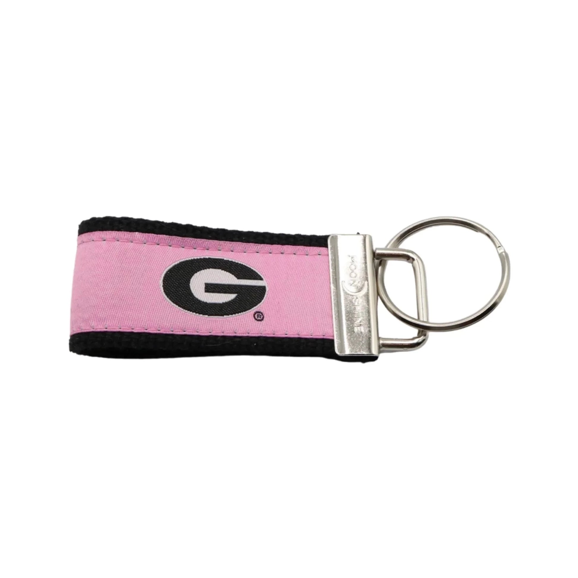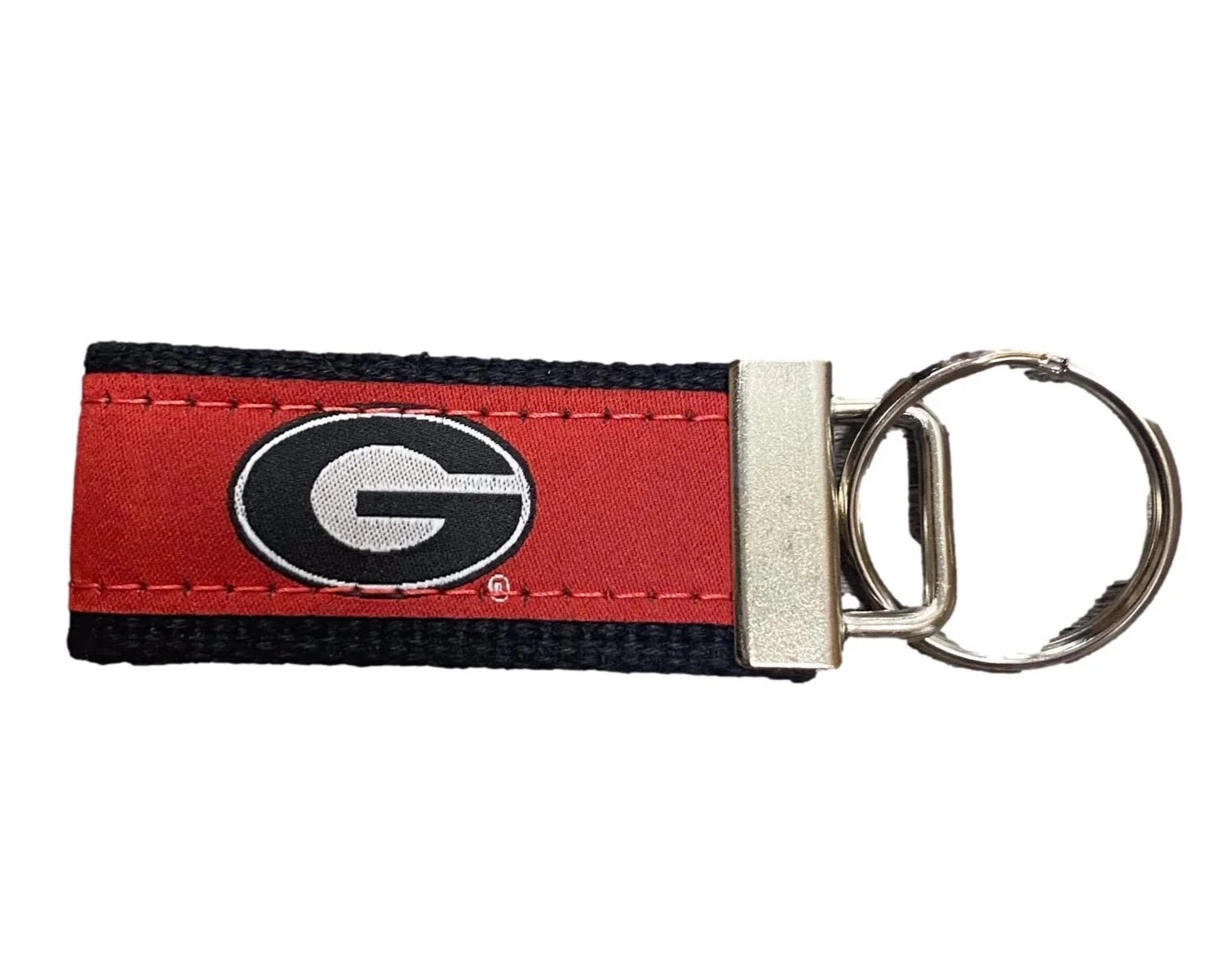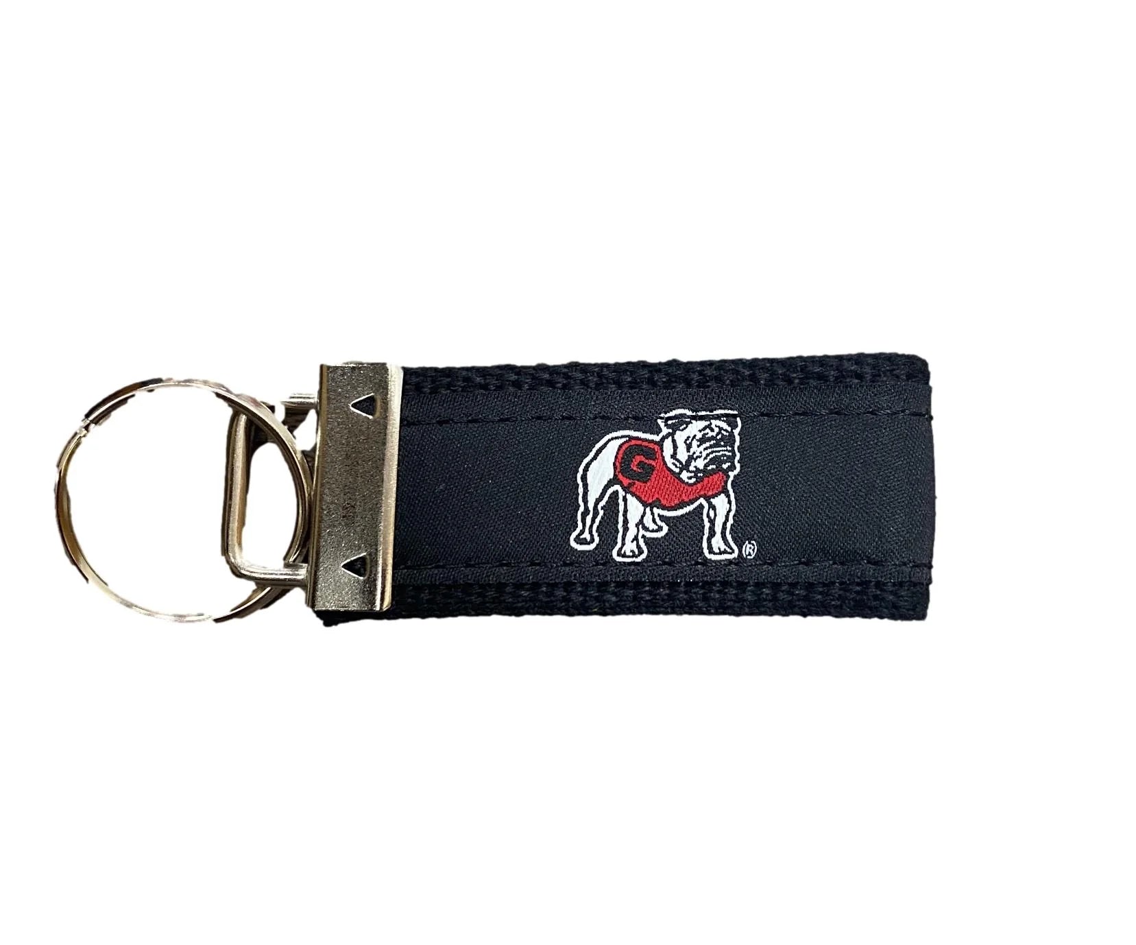 University of Georgia Ribbon Keychain. Available in Red, Black, Pink and Stripe with the oval G. Black with the Standing Bulldog.