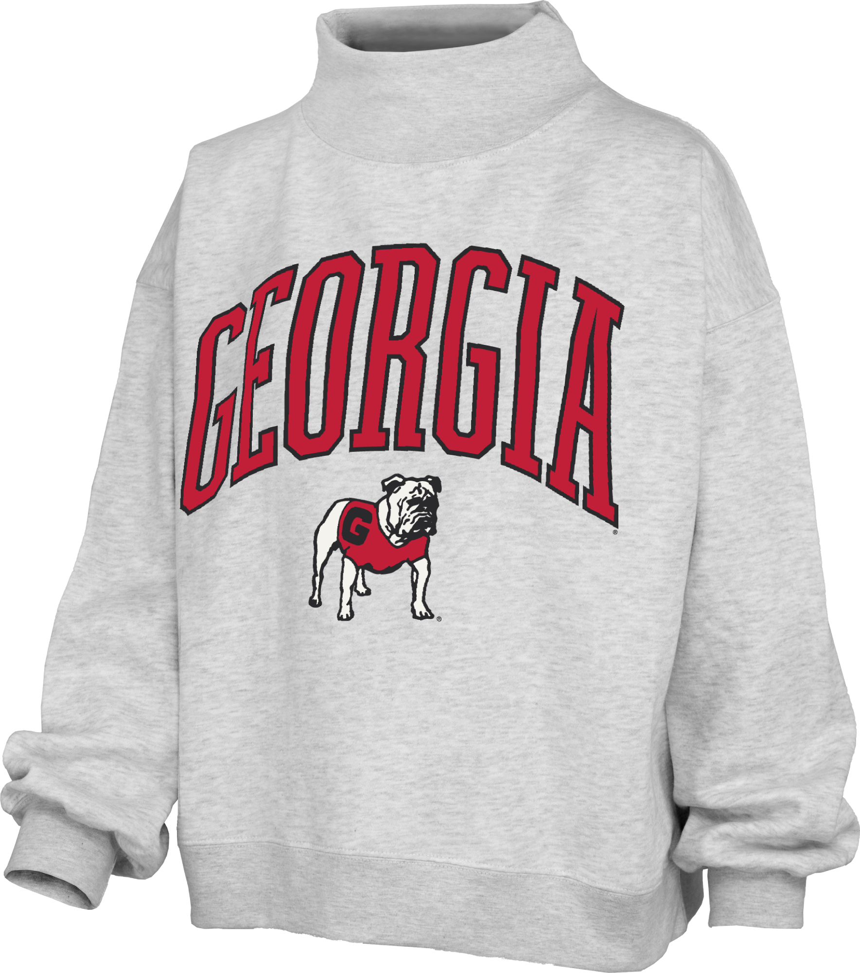 Stay comfortable and stylish with this University of Georgia "Nelson Lingo" Longsleeve Mock-Crew Oversize Fleece in Ash with screenprinted Georgia over our Standing Bulldog. Crafted for a relaxed fit, this fleece combines warmth and breathability, making it ideal for layering during cooler days. Its mock-crew neckline adds a modern touch, while the oversized design ensures ease of movement. Perfect for showing school spirit with subtle sophistication, this piece blends Georgia Bulldog pride with everyday comfort.