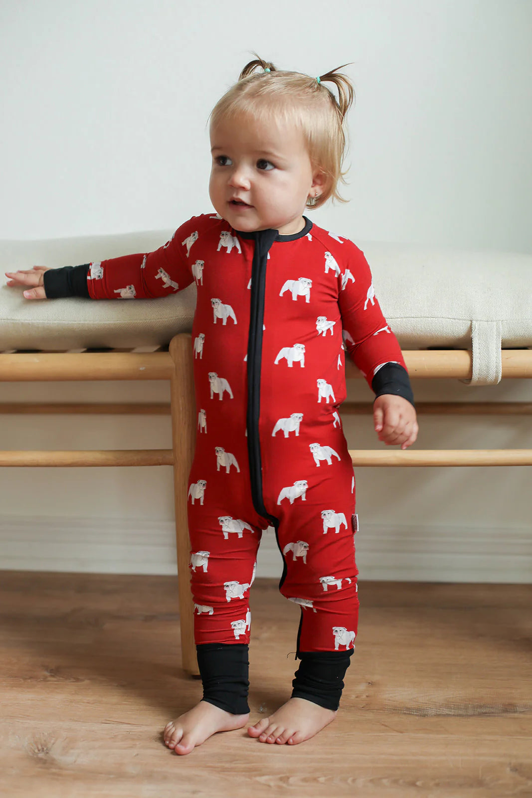 Red Georgia Bulldog double zipper sleeper is made of the softest material - viscose from bamboo! So gentle on skin and perfect for any season, which is great because these sleepers last much longer than your average pajamas due to bamboos amazing stretch abilities.