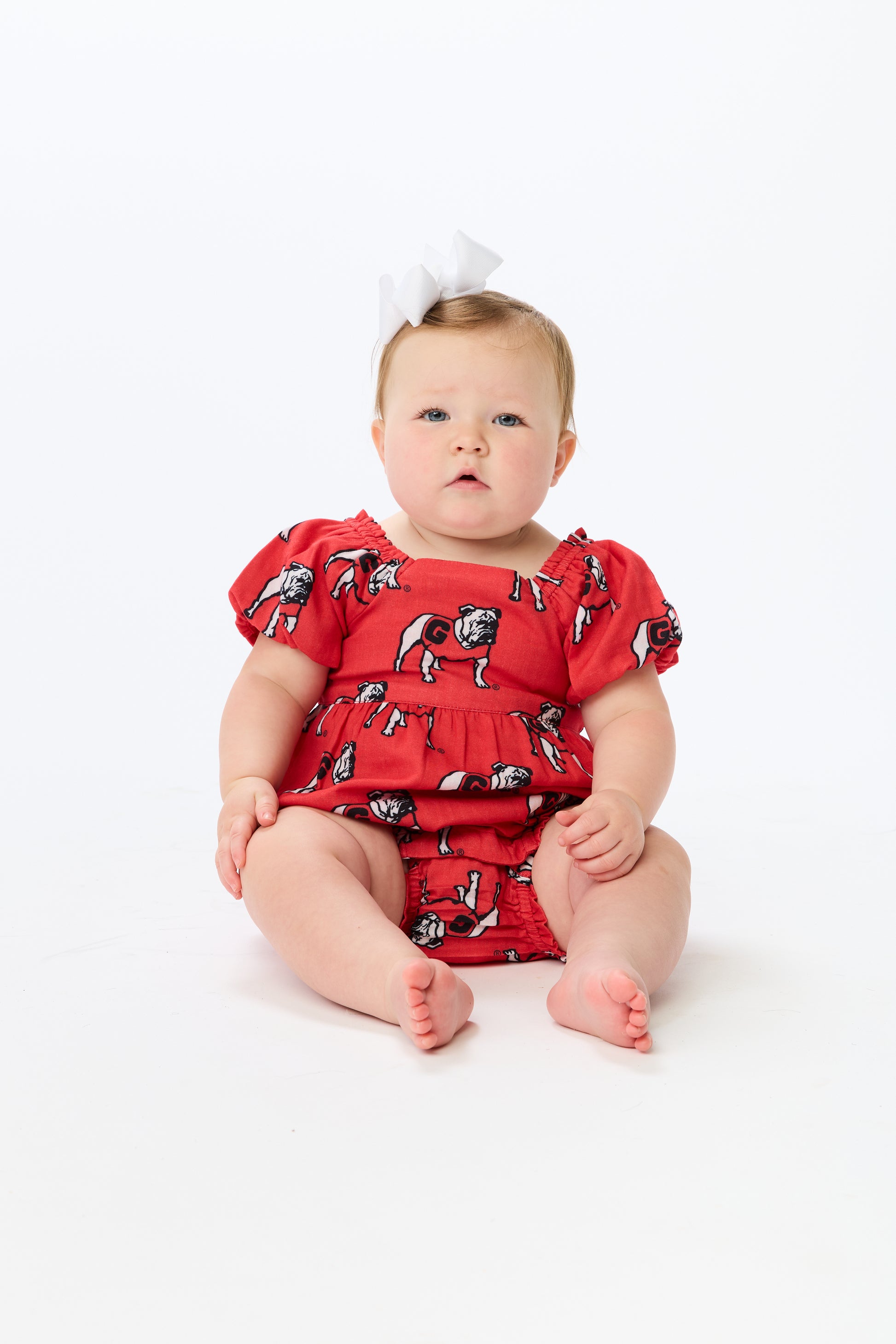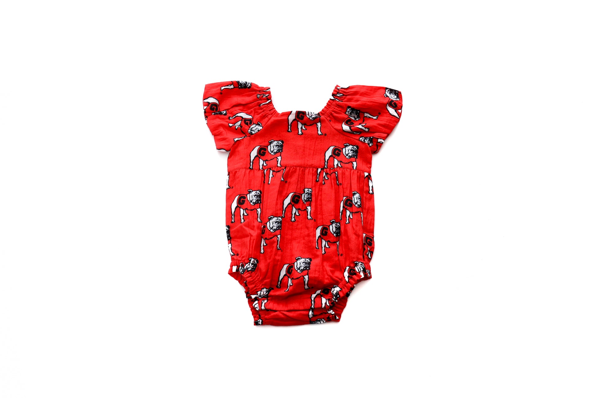 This onesie is the perfect addition to your baby’s closet! The gauze fabrication and short puff sleeves are extra cute and the snaps at the inseam make it easy for getting baby girl dressed for game day. 100% cotton