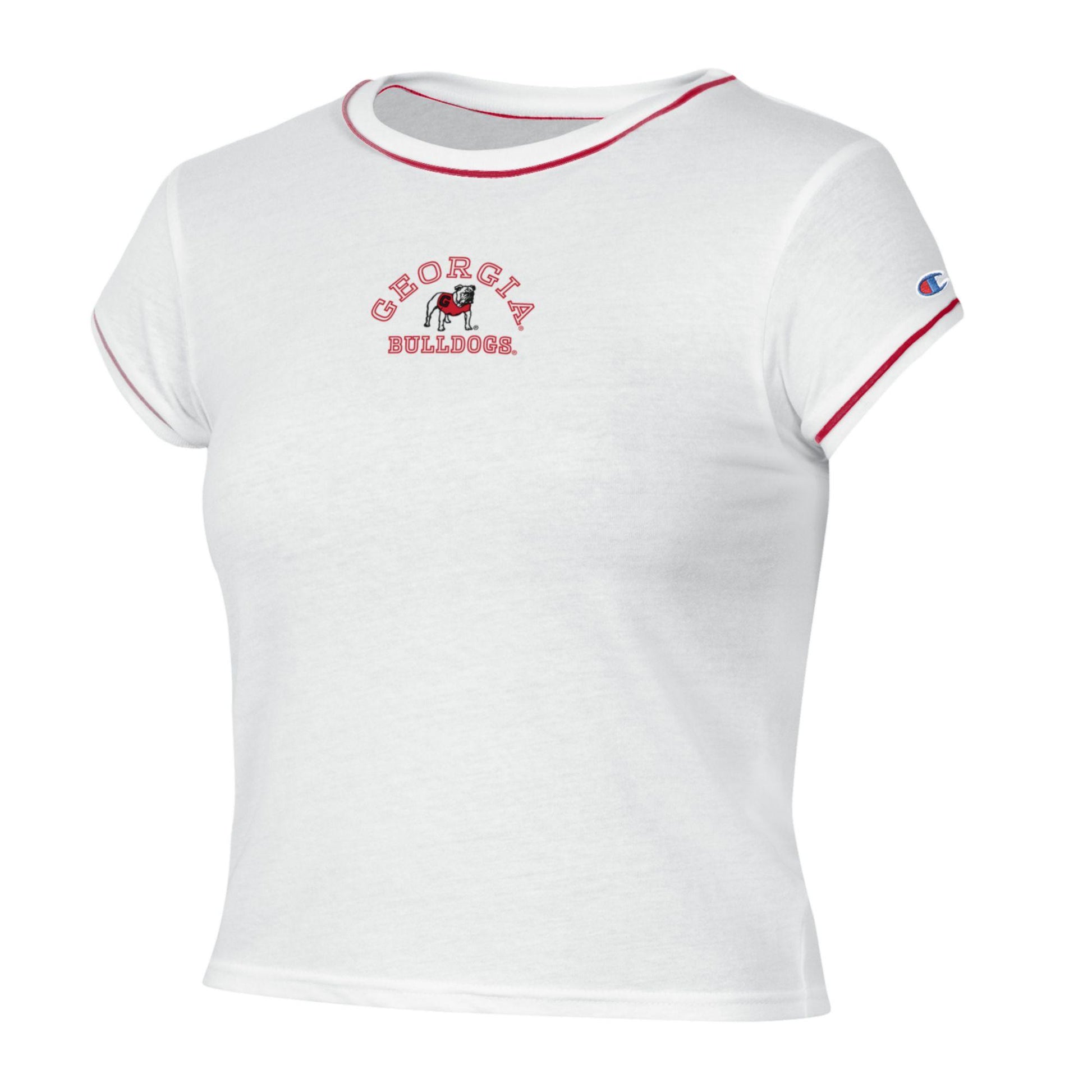 Show off your Bulldogs pride with this stylish Ladies Champion Cropped Tee. Designed with a modern, flattering cropped fit, this tee features a clean white design with red contrast trim at the neckline and sleeves for a sporty, vintage-inspired look. The front showcases a classic Georgia Bulldogs graphic, making it the perfect piece for game days, campus events, or casual everyday wear.