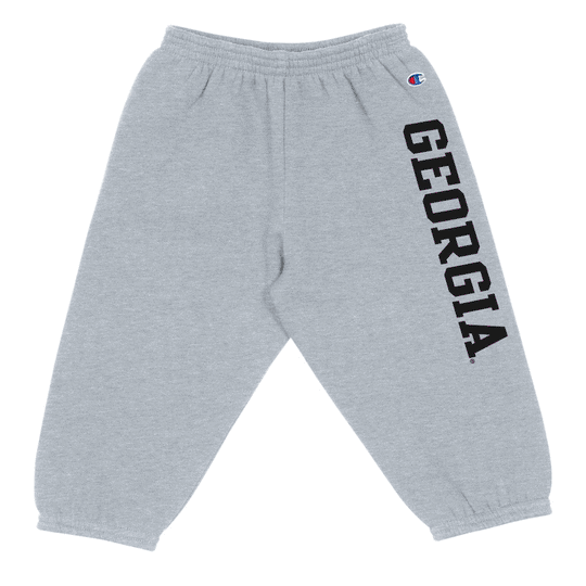 University of Georgia grey sweatpants with georgia word graphic on left leg.