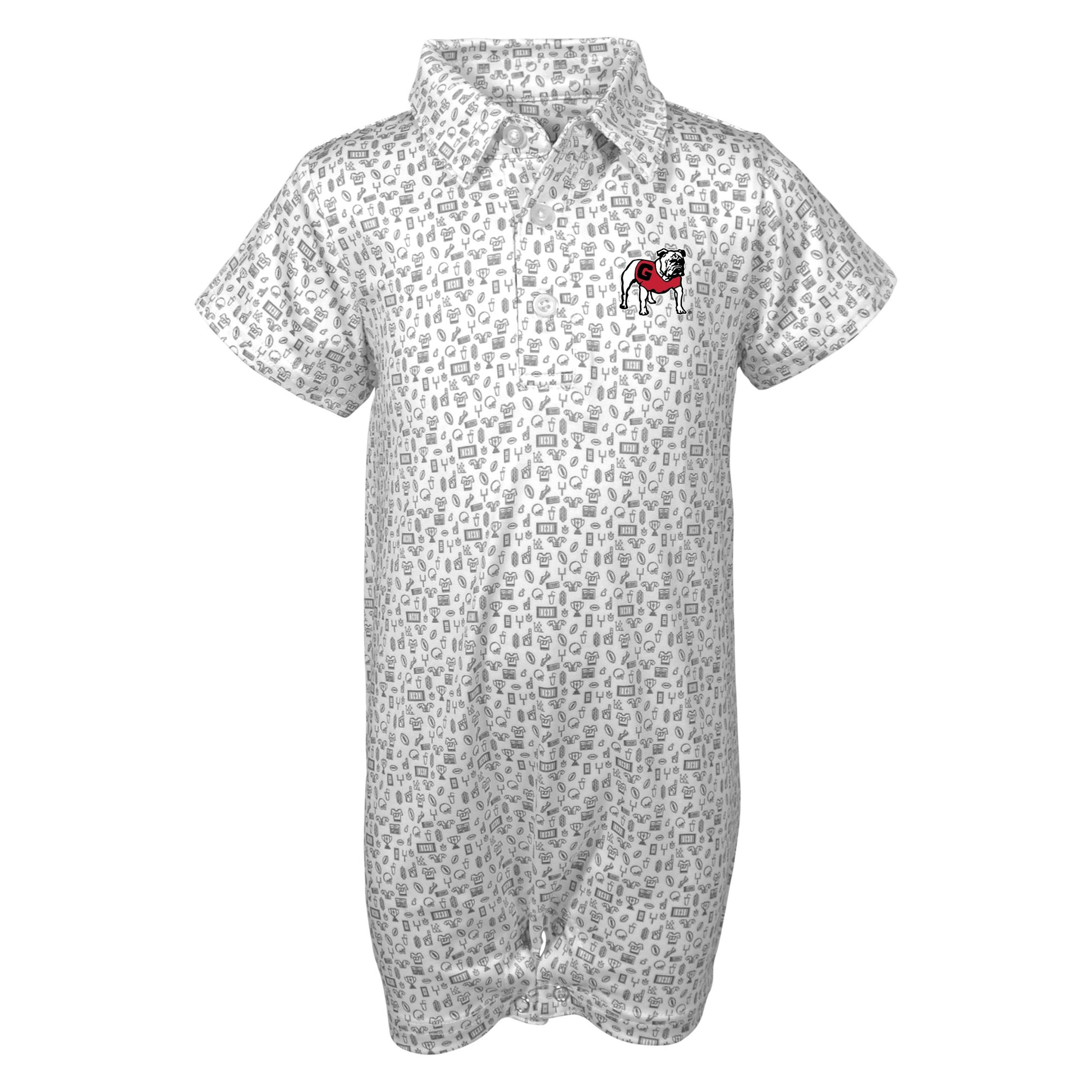 University of Georgia infant polo onesie with standing bulldog and gameday icons.