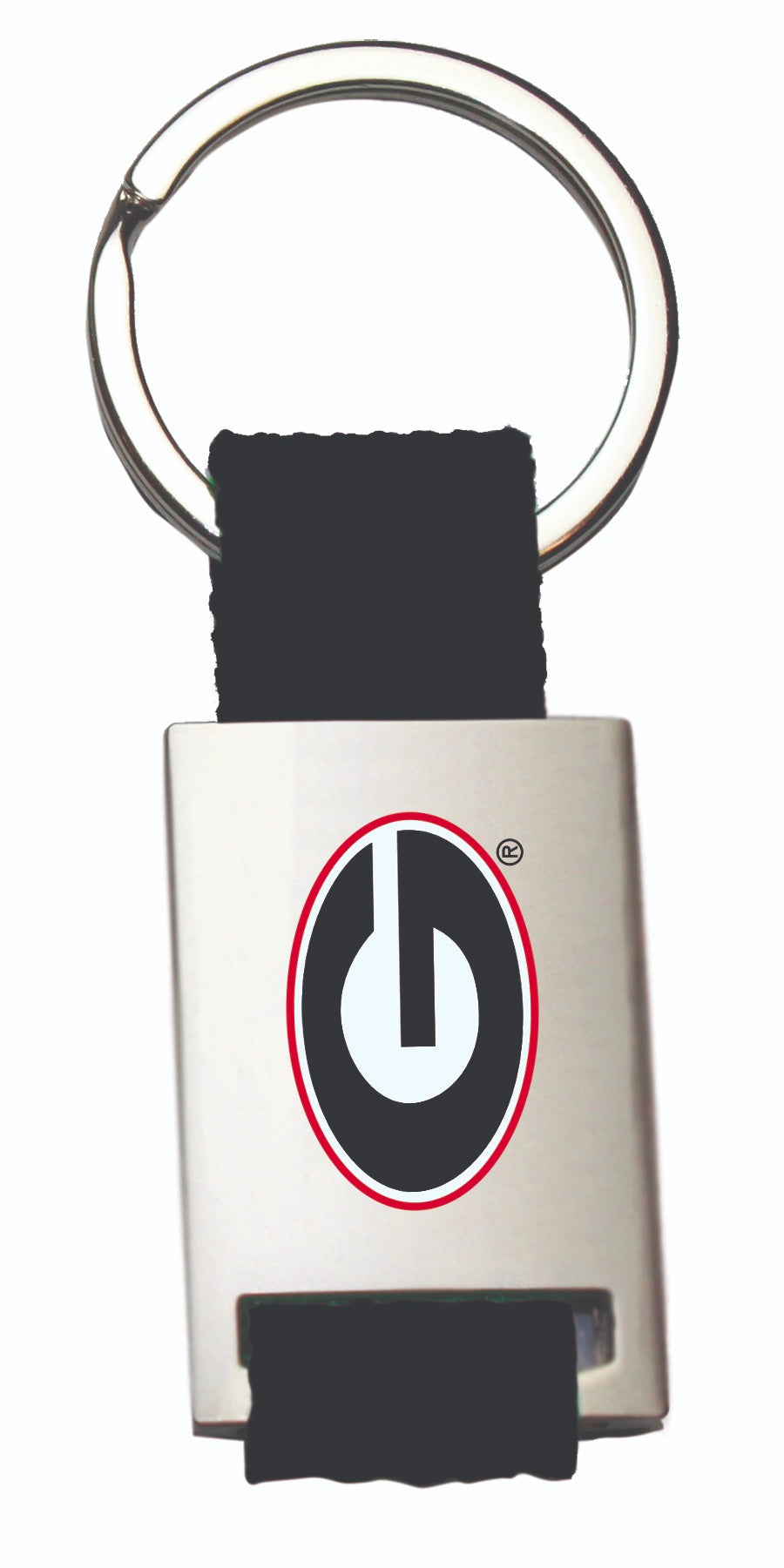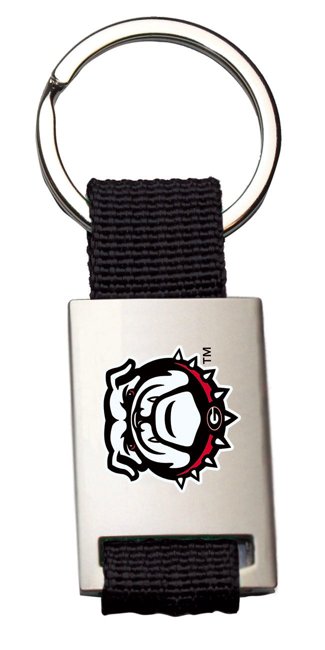 University of Georgia metal square keychain with black loop. Comes with power G or new bulldog head.