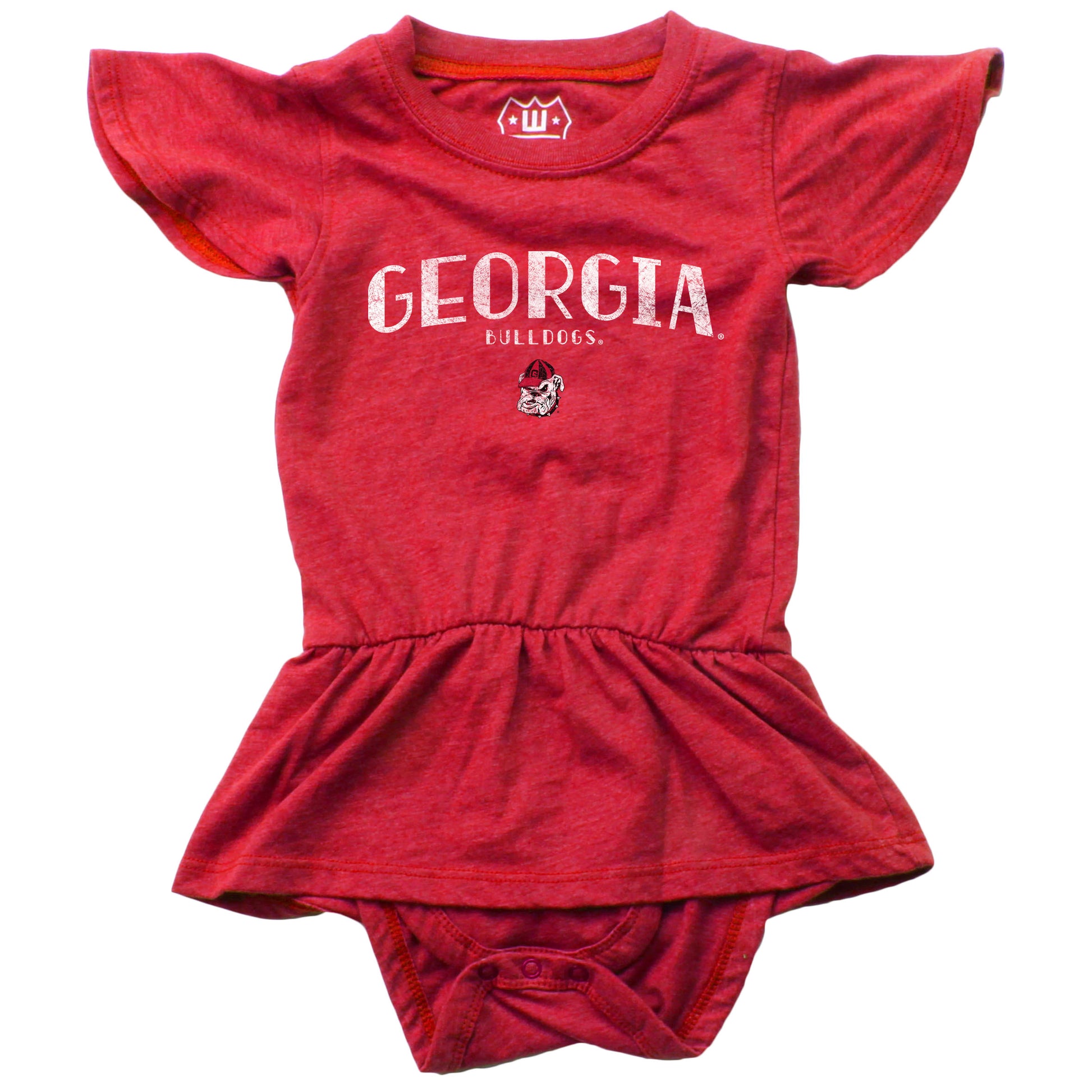 University of Georgia Onesie with ruffle sleeves and old bulldog head graphic.
